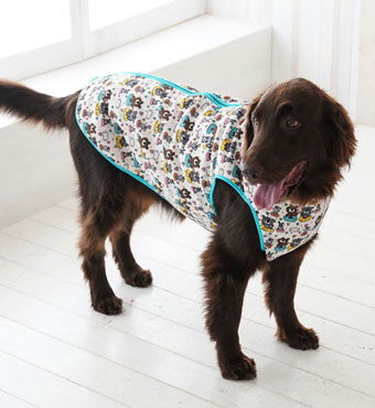beache holic人気キャラの総柄ベストの犬の服。冬の定番フリース素材。背中ジッパーで洋服を嫌がる大型わんこにも着せやすいのがうれしい。