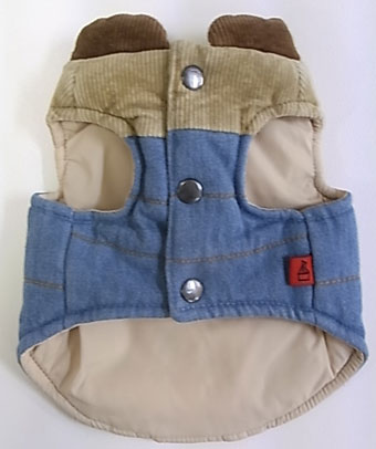 人間用をそのまま小さくした様な西海岸スタイル好きにはたまらないデニム中綿ベストの犬の服。部分的にWashをかけたデニムでこなれ感UP!DSLコーデュロイOP&ALLのアウターでコーデするとCOOL♪