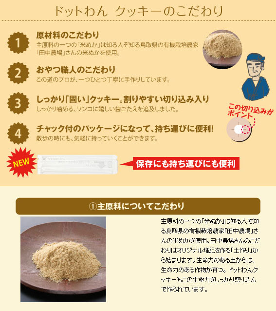 かわいいワンコのために本来持つ能力を活性化する「天然素材」を毎日与えたい・・・でも、いざ続けようと思うと飼い主さんにとっては大変な負担です。 そこで天然成分を手軽に摂取できるおやつをと考え、商品化したのが「ドットわんクッキーシリーズ」。「ドットわん」とこの道20年の「犬のおやつ職人」が思いを込めて手作り。材料はもちろん人間用の食材を使用。さらに減農薬、有機栽培にもこだわった「天然を食べる」ためのクッキーです。 米ぬかとマッシュポテトをベースに様々な天然食材をふんだんに使いました。「生命力」のある食べ物を定期的に与えることで、ワンコが本来持つ能力をサポートし、健康な状態を維持して欲しいと考えています。また、油やバターを使わない製法なので、ワンコが毎日「おねだり」できる嬉しい低カロリーのおやつ&健康犬サポートフードです。米ぬかにはビタミン、食物繊維、ミネラル、注目の成分「フィチン酸」がたくさん含まれています。 主原料の一つの「米ぬか」は知る人ぞ知る鳥取県の有機栽培農家「田中農場」さんの米ぬかを使用。田中農場さんのこだわりはオリジナル堆肥を作る「土作り」から始まります。生命力のある土からは、生命力のある作物が育つ。 ドットわんクッキーもこの生命力をしっかり盛り込んで作られています。 <おやつ職人>のこだわりは材料で使用する「じゃがいも」・「鶏レバー」に既製品のペーストを使わず、生の素材から調理するところから始まります。「皮むき」・「茹でる」・「潰す」等の下ごしらえ、この細部にわたる手間ひまによって、低温乾燥で栄養素を壊さず、しっかりとした噛みごたえのある「ドットわんクッキー」が仕上がります。油やバターを一切使用していない、嬉しい低カロリークッキーです。「ドットわんクッキー」の”固さ”もこだわりの一つです。しっかり噛める、わんこに嬉しい歯ごたえを追及しました。「ドットわんクッキー」の”固さ”もこだわりの一つです。しっかり噛める、わんこに嬉しい歯ごたえを追及しました。 ポリフェノール+食物繊維 むらさき芋は天然ポリフェノールの宝庫。また、たんぱく質、炭水化物、脂質のバランスもすぐれもの。ビタミンや食物繊維も豊富に併せ持っているマルチな健康野菜「むらさき芋」をふんだんに使った無添加おやつです。