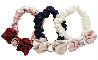 上品なデザインのシュシュタイプのネックレス。パールに飾られた大粒のストーンがゴージャス! 今日はリボンでビシッと決めてみる