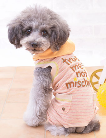 ディーズチャット毎年人気のつなぎシリーズの犬の服。ボーダーニット素材にフードとポケットを付けてキッズカジュアルを意識したつなぎ