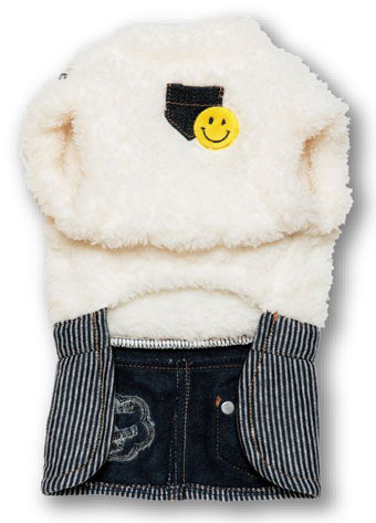 大人気のムーンスマイルアップリケと相性抜群のヒッコリーの犬の服。サロペット風に仕上げました。昨年大人気のキラキラスマイルの進化バージョンです。ふわふわの伸縮性のボアを使用しています。