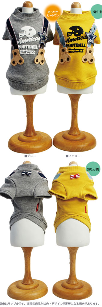 サスペンダーが印象的な犬の服 Tシャツ。アメフトモチーフの発泡プリントに革のクリップワッペン♪サスペンダーにキラキラ星のワッペン。